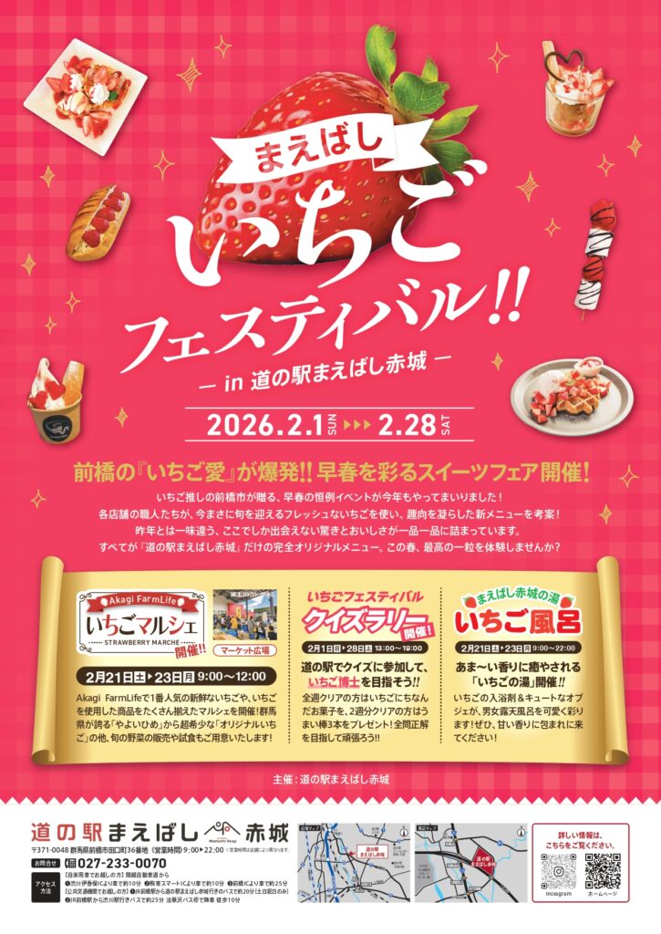 2/1(日)~2/28(土) 道の駅まえばし赤城で「いちごフェスティバル」開催 道の駅まえばし赤城の各店舗が考案した自慢のオリジナルメニューを味わうことができます。見た目も鮮やかないちごメニューを、ぜひお楽しみください! また、イベント期間中は「いちごマルシェ」や「いちごフェスティバルクイズラリー」、さらには「まえばし赤城の湯」がいちご風呂に変わるなど、いちご好きの方必見の企画が盛りだくさんです